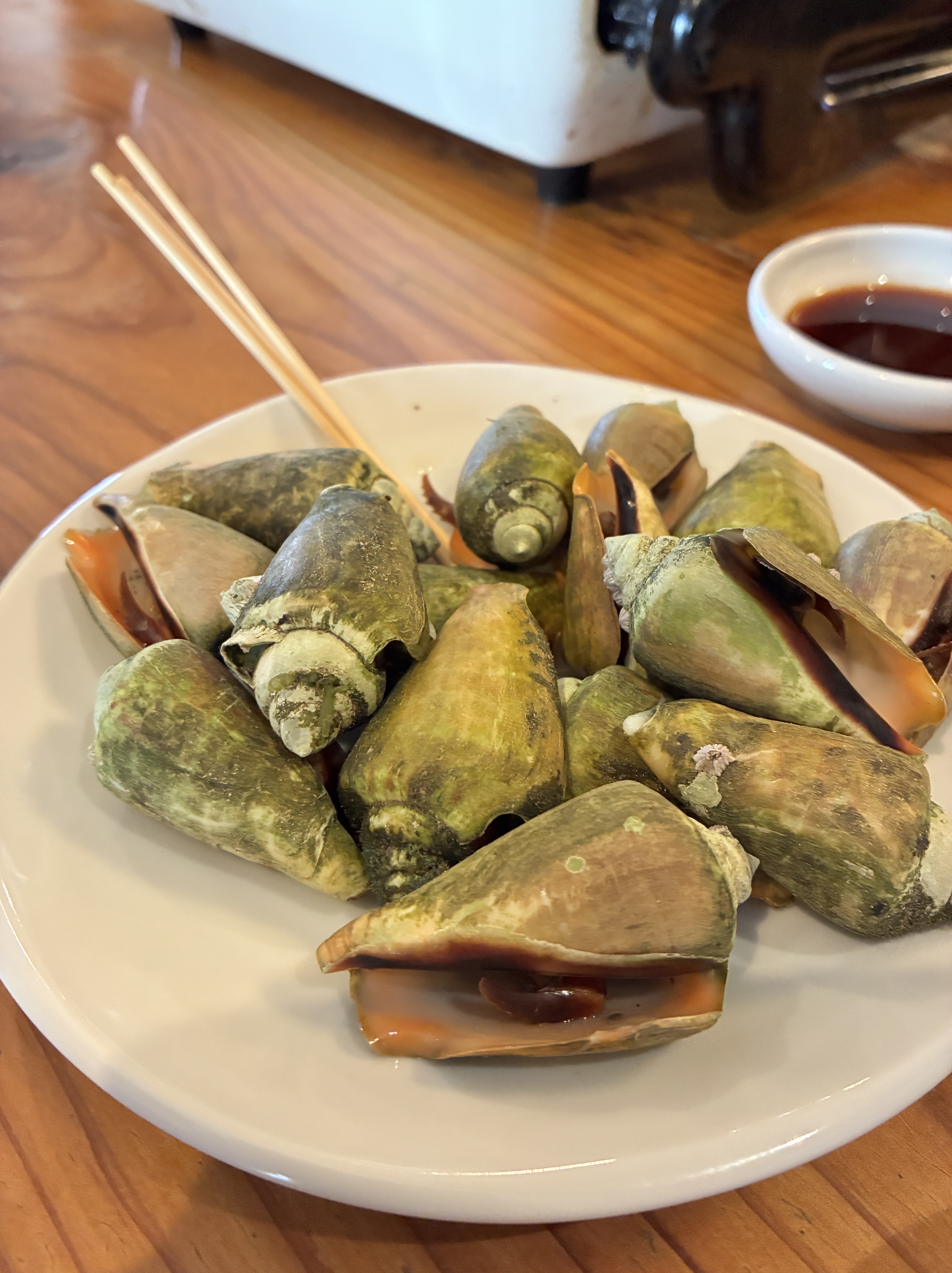 中身をくるくる楊枝で引っ張り出して、湯浅のたまり醤油で食べる。おいしい!